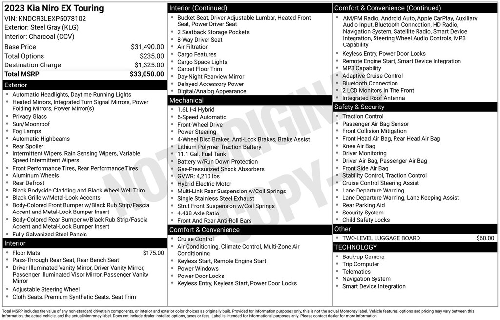 Love the 23 Niro HEV. Getting 50-51 MPG. Nice vehicle for seniors as easy to get in and out plus all the safety features (Lots). Would definitely purchase again