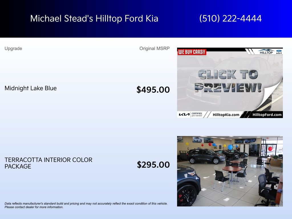Our team is professional, and we offer a no-pressure environment. We'd be happy to answer any questions that you may have. We are here to help you Whether you're looking for a fresh-off-the-assembly-line Ford, hunting for the ideal used car, or just need some work done on your car, Hilltop Ford KIA is the place to be. Vehicle Features May Include; Terracotta Interior Color Package, Navigation System, 10 Speakers, 3.648 Axle Ratio, 3rd row seats: split-bench, 4-Wheel Disc Brakes, ABS brakes, Air Conditioning, Alloy wheels, AM/FM radio: SiriusXM, Apple CarPlay & Android Auto, Auto High-beam Headlights, Auto-dimming Rear-View mirror, Auto-leveling suspension, Automatic temperature control, Brake assist, Bumpers: body-color, Carpet Floor Mats, Compass, Delay-off headlights, Driver door bin, Driver vanity mirror, Dual front impact airbags, Dual front side impact airbags, Electronic Stability Control, Emergency communication system: 911 Connect, Exterior Parking Camera Rear, Four wheel independent suspension, Front anti-roll bar, Front Bucket Seats, Front Center Armrest, Front dual zone A/C, Front fog lights, Front reading lights, Fully automatic headlights, Garage door transmitter: HomeLink, harman/kardon® Speakers, Heads-Up Display, Heated & Ventilated Front Bucket Seats, Heated door mirrors, Heated front seats, Heated rear seats, Heated steering wheel, Illuminated entry, Knee airbag, Leather Shift Knob, Leather steering wheel, Low tire pressure warning, Memory seat, Occupant sensing airbag, Outside temperature display, Overhead airbag, Overhead console, Panic alarm, Passenger door bin, Passenger vanity mirror, Power door mirrors, Power driver seat, Power Liftgate, Power moonroof, Power passenger seat, Power steering, Power windows, Premium Nappa Leather Seat Trim, Radio data system, Radio: AM/FM harman/kardon Audio System, Rain sensing wipers, Rear air conditioning, Rear anti-roll bar, Rear audio controls, Rear reading lights, Rear side impact airbag, Rear window defroster, Rear window wiper, Reclining 3rd row seat, Remote keyless entry, Roof rack: rails only, Security system, Smart Key w/ Push Button and Remote Start, Speed control, Speed-sensing steering, Split folding rear seat, Spoiler, Steering wheel mounted audio controls, Tachometer, Telescoping steering wheel, Tilt steering wheel, Traction control, Trip computer, Turn signal indicator mirrors, Variably intermittent wipers, Ventilated front seats, Ventilated rear seats, and Wheels: 20" x 7.5" Black Finish X-LINE Exclusive.