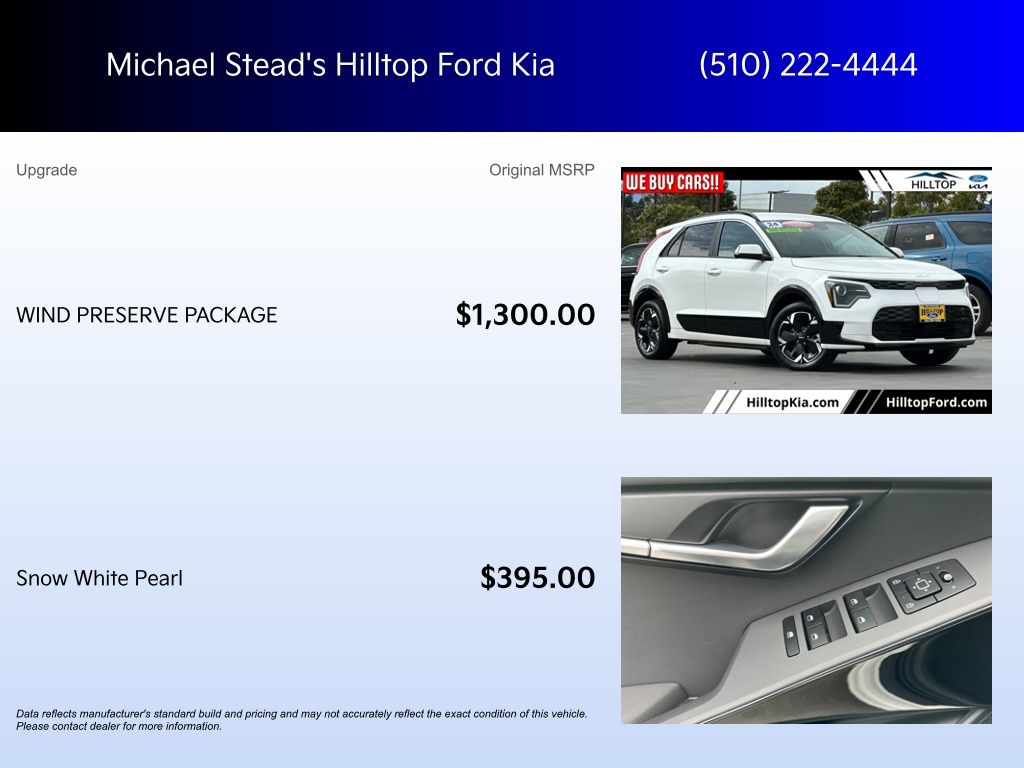 Our team is professional, and we offer a no-pressure environment. We'd be happy to answer any questions that you may have. We are here to help you Whether you're looking for a fresh-off-the-assembly-line Ford, hunting for the ideal used car, or just need some work done on your car, Hilltop Ford KIA is the place to be. Vehicle Features May Include; Wind Preserve Package (Heat Pump, Heated Rear Seats, and Heated Steering Wheel), Navigation System, 10.65 Axle Ratio, 4-Wheel Disc Brakes, 6 Speakers, 7J x 17" Alloy Wheels, ABS brakes, Air Conditioning, Alloy wheels, AM/FM radio: SiriusXM, Apple CarPlay & Android Auto, Auto High-beam Headlights, Automatic temperature control, Brake assist, Bumpers: body-color, Carpet Floor Mats, Cloth & Vegan Leather-Trimmed Seats, Delay-off headlights, Driver door bin, Driver vanity mirror, Dual front impact airbags, Dual front side impact airbags, Electronic Stability Control, Emergency communication system: Kia Connect (includes 1 year free trial), Exterior Parking Camera Rear, Four wheel independent suspension, Front anti-roll bar, Front Bucket Seats, Front Center Armrest, Front dual zone A/C, Front reading lights, Fully automatic headlights, Heated door mirrors, Heated Front Bucket Seats (3-Steps), Heated front seats, Illuminated entry, Knee airbag, Low tire pressure warning, Mud Guards, Occupant sensing airbag, Outside temperature display, Overhead airbag, Overhead console, Panic alarm, Passenger door bin, Passenger vanity mirror, Power door mirrors, Power driver seat, Power Liftgate, Power steering, Power windows, Radio: 6-Speaker Audio System, Rain sensing wipers, Rear anti-roll bar, Rear seat center armrest, Rear window defroster, Rear window wiper, Remote keyless entry, Security system, Speed control, Speed-sensing steering, Split folding rear seat, Spoiler, Steering wheel mounted audio controls, Telescoping steering wheel, Tilt steering wheel, Traction control, Trip computer, Turn signal indicator mirrors, and Variably intermittent wipers.