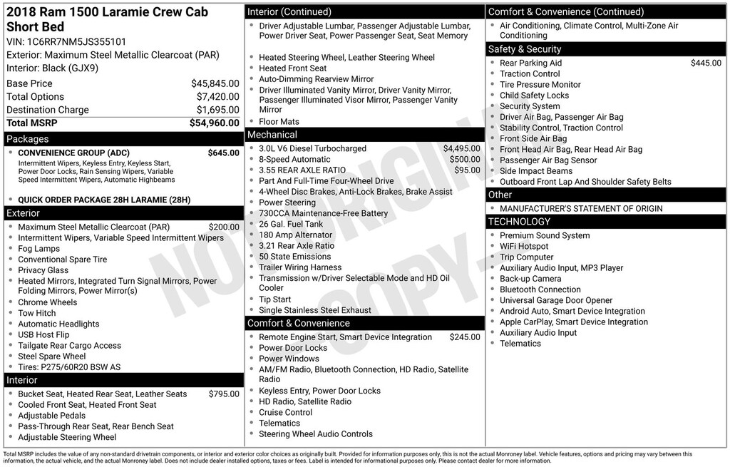 Our team is professional, and we offer a no-pressure environment. We'd be happy to answer any questions that you may have. We are here to help you Whether you're looking for a fresh-off-the-assembly-line Ford, hunting for the ideal used car, or just need some work done on your car, Hilltop Ford KIA is the place to be. Vehicle Features May Include; Convenience Group (Auto High Beam Headlamp Control, Keyless Enter-N-Go, Rain Sensitive Windshield Wipers, and Remote Proximity Keyless Entry), Quick Order Package 28H Laramie, 1-Yr SiriusXM Guardian Trial, 115V Auxiliary Power Outlet, 20" x 9" Chrome Clad Aluminum Wheels, 4-Wheel Disc Brakes, 6 Speakers, 8.4" Touchscreen Display, 9 Alpine Speakers w/Subwoofer (DISC), ABS brakes, Active Grille Shutters, Adjustable pedals, Air Conditioning, Alloy wheels, AM/FM radio: SiriusXM, Apple CarPlay, Apple CarPlay/Android Auto, Audio Jack Input for Mobile Devices, Audio memory, Auto-dimming door mirrors, Auto-dimming Rear-View mirror, Automatic temperature control, Brake assist, Bumpers: chrome, Center Hub, Compass, Delay-off headlights, Driver door bin, Driver vanity mirror, Dual front impact airbags, Dual front side impact airbags, Electronic Shift, Electronic Stability Control, Emergency communication system: SiriusXM Guardian, Folding Flat Load Floor Storage, Front anti-roll bar, Front Center Armrest w/Storage, Front dual zone A/C, Front fog lights, Front reading lights, Front wheel independent suspension, Fully automatic headlights, Garage door transmitter, Google Android Auto, GPS Antenna Input, HD Radio, Heated door mirrors, Heated Front Seats, Heated front seats, Heated steering wheel, High Back Seats, Illuminated entry, Integrated Voice Command w/Bluetooth, Leather steering wheel, Leather Trim 40/20/40 Bench Seat, Low tire pressure warning, Manufacturer's Statement of Origin, Media Hub (2 USB, AUX), Memory seat, Occupant sensing airbag, Outside temperature display, Overhead airbag, Overhead console, Panic alarm, ParkSense Front/Rear Park Assist System, ParkView Rear Back-Up Camera, Passenger door bin, Passenger vanity mirror, Pedal memory, Power 10-Way Memory Driver & 6-Way Passenger Seats, Power door mirrors, Power driver seat, Power passenger seat, Power steering, Power windows, Radio data system, Radio: Uconnect 4C w/8.4" Display, Rear 60/40 Split Folding Seat, Rear anti-roll bar, Rear seat center armrest, Rear step bumper, Remote keyless entry, Remote Start System, Remote USB Port, Security system, SiriusXM Satellite Radio, Speed control, Split folding rear seat, Steering wheel mounted audio controls, Tachometer, Tilt steering wheel, Tip Start, Traction control, Trip computer, Turn signal indicator mirrors, USB Host Flip, Variably intermittent wipers, Ventilated Front Seats, Ventilated front seats, and Voltmeter.