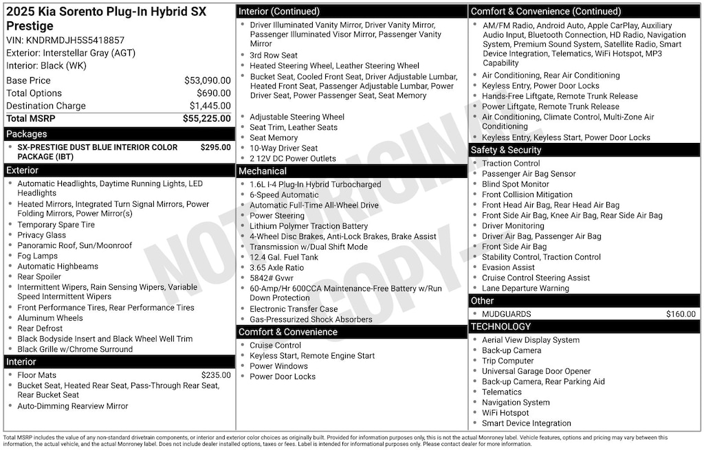 Interstellar Gray 2025 Kia Sorento Plug-In Hybrid SX Prestige AWD 6-Speed Automatic 1.6L I4 DGI Hybrid Turbocharged DOHC 16V LEV3-SULEV30 Dust Blue Leather Seats, SX-Prestige Dust Blue Interior Color Package. Price includes: $4000 - KFA Dealer Choice Program: $4000 discount and 5.25% APR for 36 months. $30.08 per $1000 financed. Available to well qualified buyers who finance through Kia Finance America. 506. Exp. 02/02/2026
